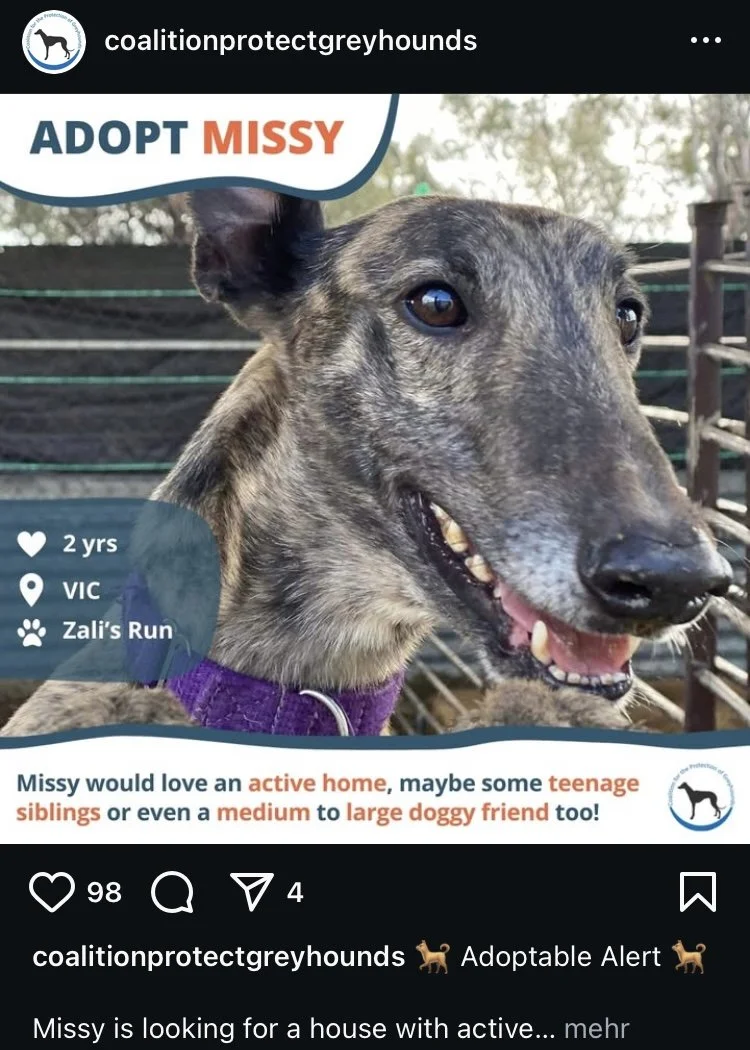 From 2023 to 2024 I worked with an organisation called the Coalition for the Protection of Greyhounds. This is a non-profit organisation raising awareness about the truth behind greyhound racing in Australia. They work together with local governments, business and other organisations to ultimately put an end to greyhound racing. In the meantime they have helped to put in place important legislation, for example, banning racing above a certain temperature in the hot summer months for example.